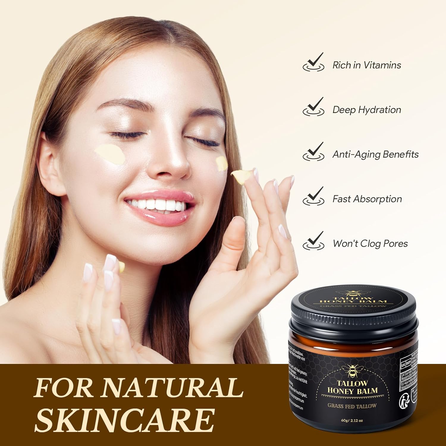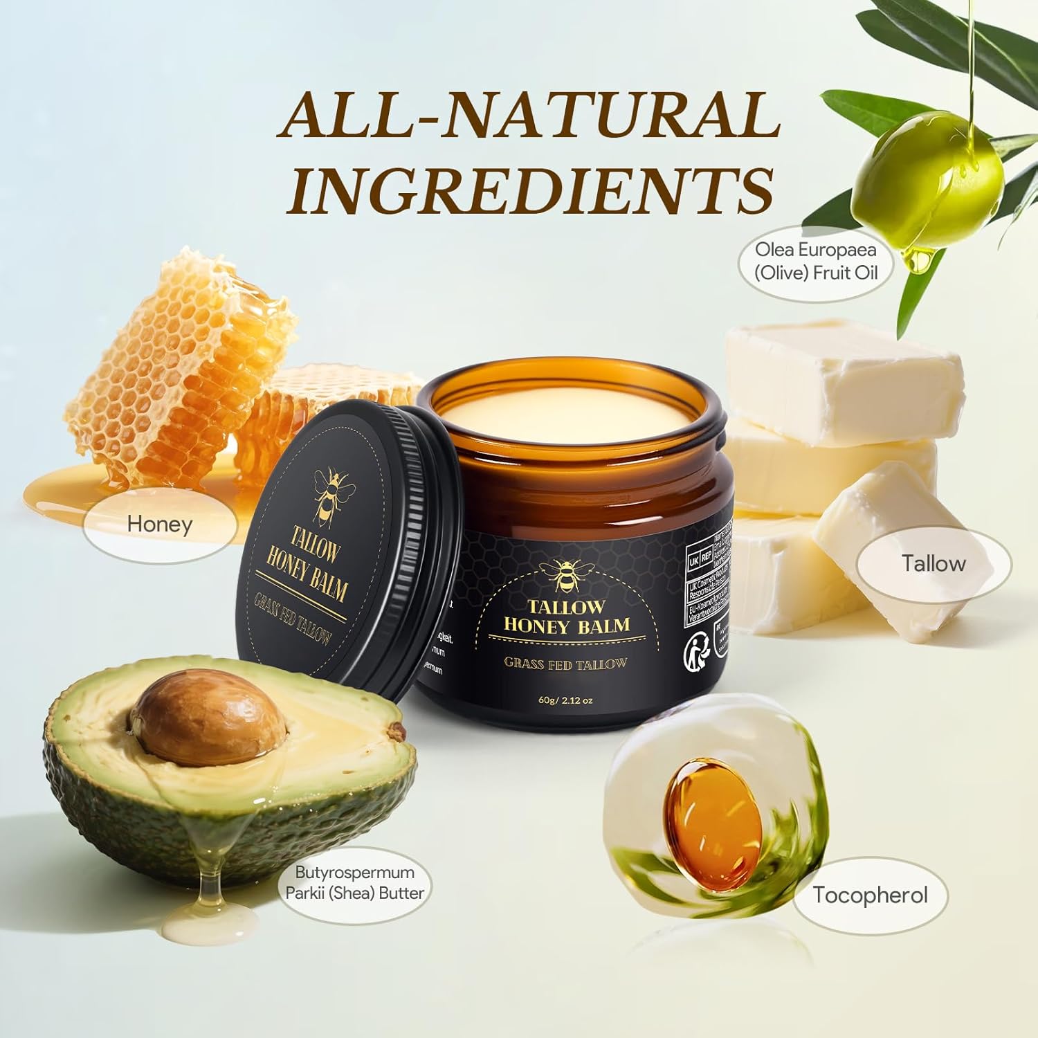 We understand that trying a new skincare product can feel intimidating. But with our Beef Tallow Honey Balm, you can feel confident knowing it surpasses homemade brands by meeting strict cosmetic standards. Perfect for all skin types, it's smooth, creamy texture absorbs deeply, providing intense hydration. Trust us, your skin will thank you.