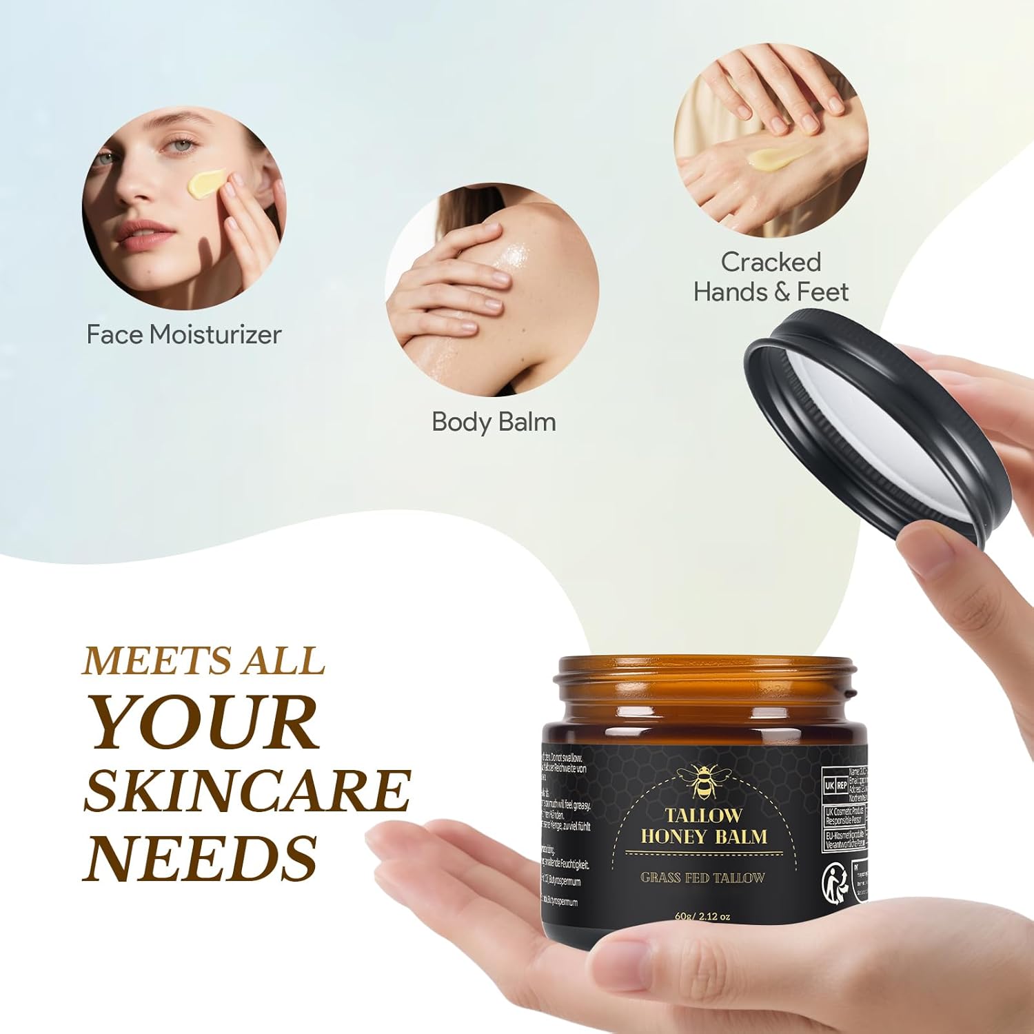 You can apply beef tallow honey balm to anywhere on your body: from your face, body, hands, feet, lips, etc. Use it anywhere you would use moisturizer, face cream, lotion, or lip balm!